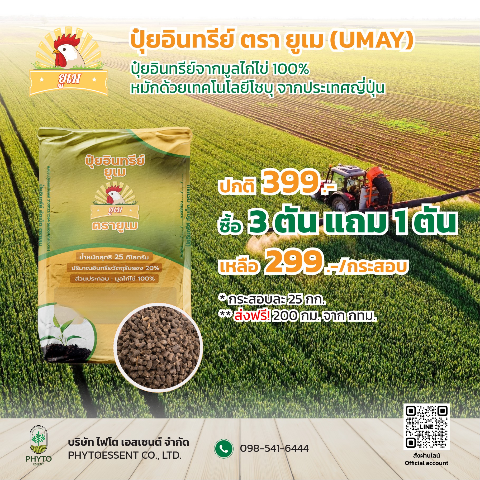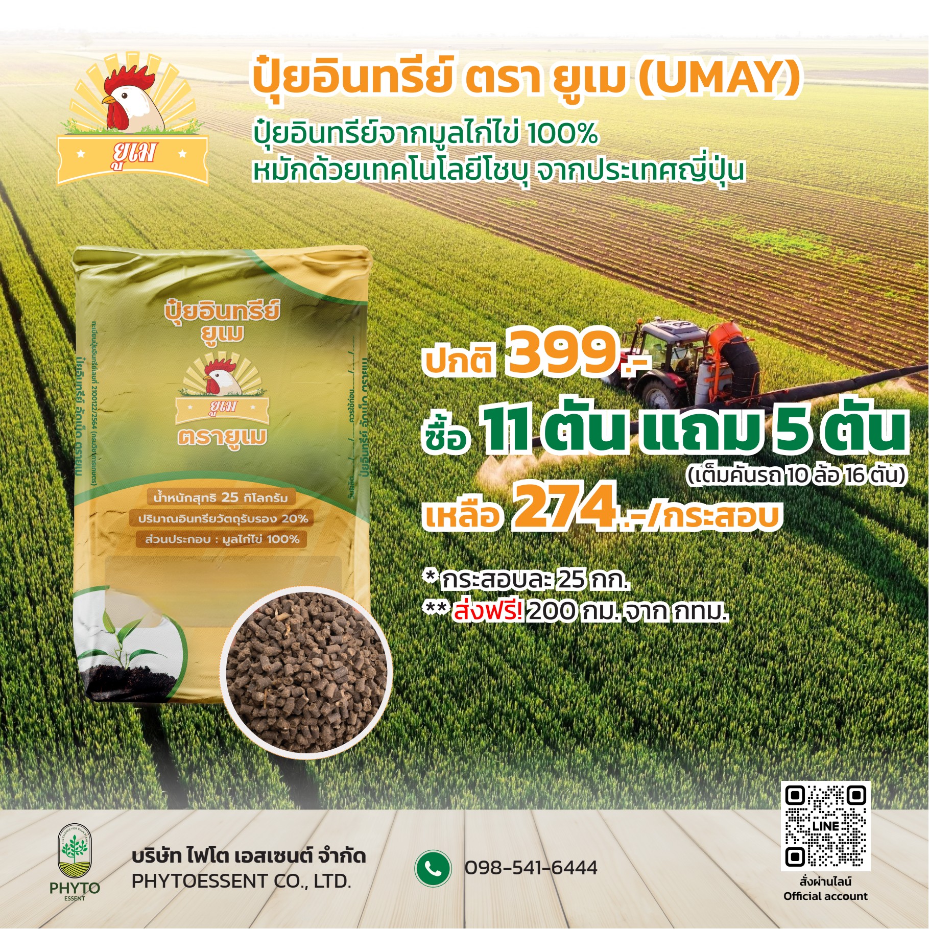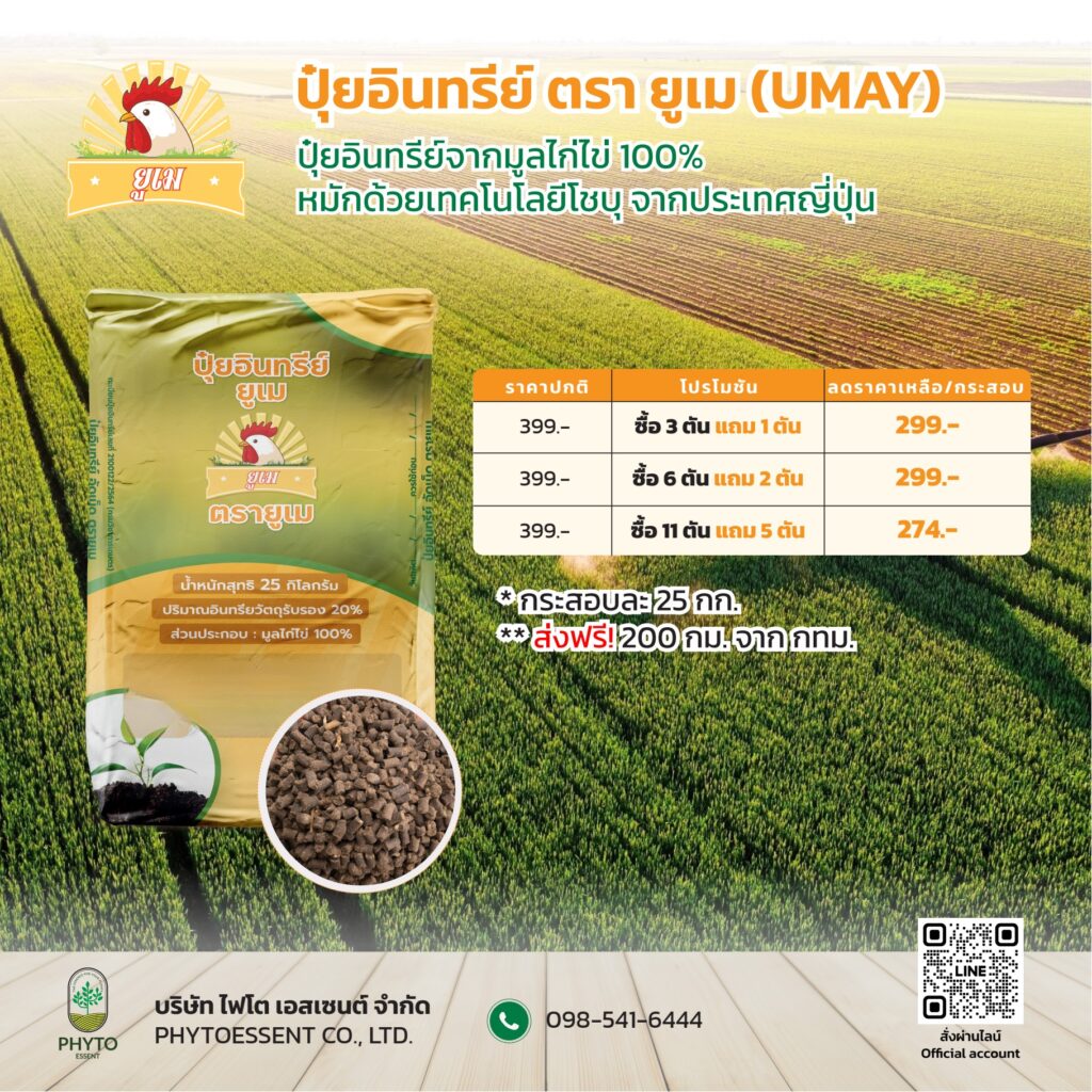 PROMOTION PROMOTION ปุ๋ยอินทรีย์ มูลไก่ไข่อัดเม็ด ตรา ยูเม (UMAY) ซื้อ 3 ตัน แถม 1 ตันปกติ 399.- เหลือ 299.-/กระสอบ ซื้อ 6 ตัน แถม 2 ตันปกติ 399.- เหลือ 299.-/กระสอบ ซื้อ 11 ตัน แถม 5 ตันปกติ 399.- เหลือ 274.-/กระสอบ สั่งซื้อติดต่อ : 098-541-6444 LINE ID : @umay